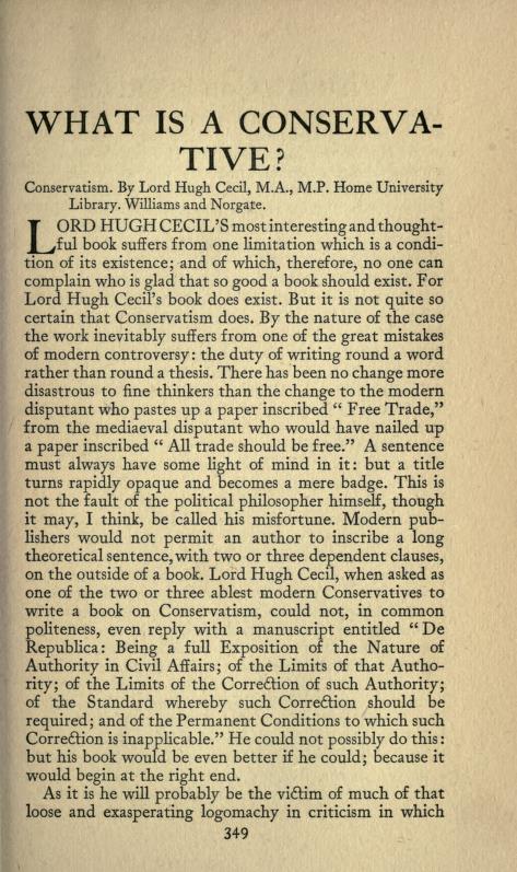 Lord Hugh Cecil, quando solicitado como um dos dois ou três conservadores modernos mais capazes a escrever um livro sobre o conservadorismo, não pôde, com polidez comum, sequer responder com um manuscrito intitulado “República: Sendo uma exposição plena A Natureza da Autoridade nos Assuntos Civis; dos Limites dessa Autoridade; dos Limites da Correção de tal Autoridade; da Norma pela qual tal Correção deve ser exigida; e das Condições Permanentes às quais tal Correção é inaplicável”. Ele não poderia fazer isso: mas seu livro seria ainda melhor se pudesse; porque começaria na extremidade direita.